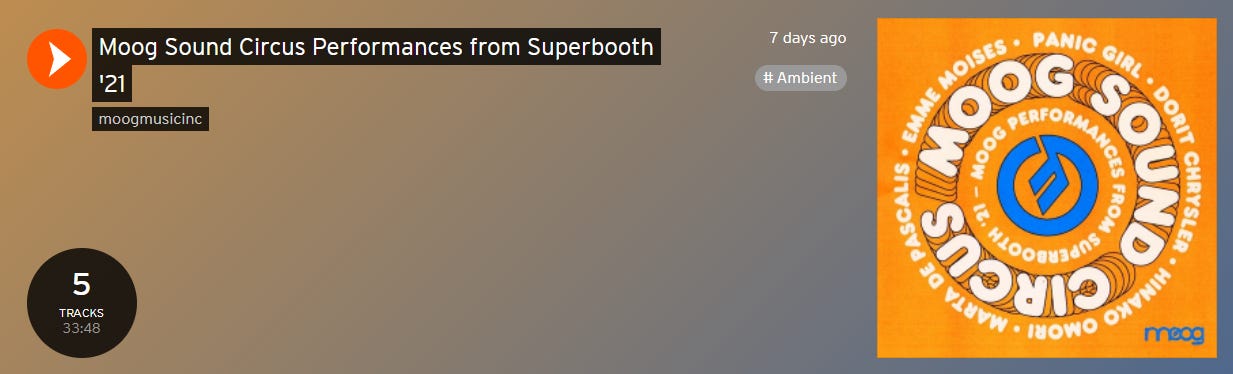 Finally, another set of live performances. Recorded at Superbooth 2021, a synthesizer trade fair that took place in Berlin, Moog invited artists to perform with the Moog Matriarch in their Sound Circus tent. We have five tracks, from Hinako Omori, Dorit Chrysler, Panic Girl, Marta De Pascalis, and Emme Moises. Omori recently impressed with her album on Houndstooth, and here she offers a truly beautiful piece that floats and squidges with delight. Chrysler turns in her own theremin-led cover of ‘I Feel Love’. Panic Girl’s piece is wide-eyed and open, with a world of field recordings and melodies straight out of ’70s BBC TV. Moises, a sci-fi composer, creates a wonderful world that seems to feature a soaring cello although that could be entirely artificial. Finally, Marta De Pascalis, through whom I found this set, gives a wonderfully psychedelic explosion of sound that ripples and flows like the best exponents of synth-led music today. Each artist introduces their own track, which adds layers of meaning and understanding to the project. While in essence it may be a sales pitch, it’s rich and entertaining throughout.