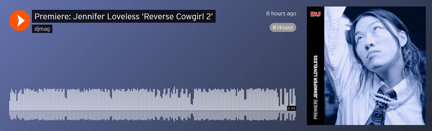 Jennifer Loveless is to drop a six-track EP on Butter Sessions next month. It’s full of stompers, but ‘Reverse Cowgirl 2’ caught my ear because of it’s resemblance to the Salt City Orchestra Nightclub Mix of ‘Post Modern Sleaze’ by Sneaker Pimps. I’m not sure if that guitar lick is a sample or just freakishly similar, but that’s what I hear. And it’s good! The tracks are very different, I should say. ‘RC2’ is a thumping banger of a track, a world away from the slower, sultry groove of its predecessor. Bang bang.